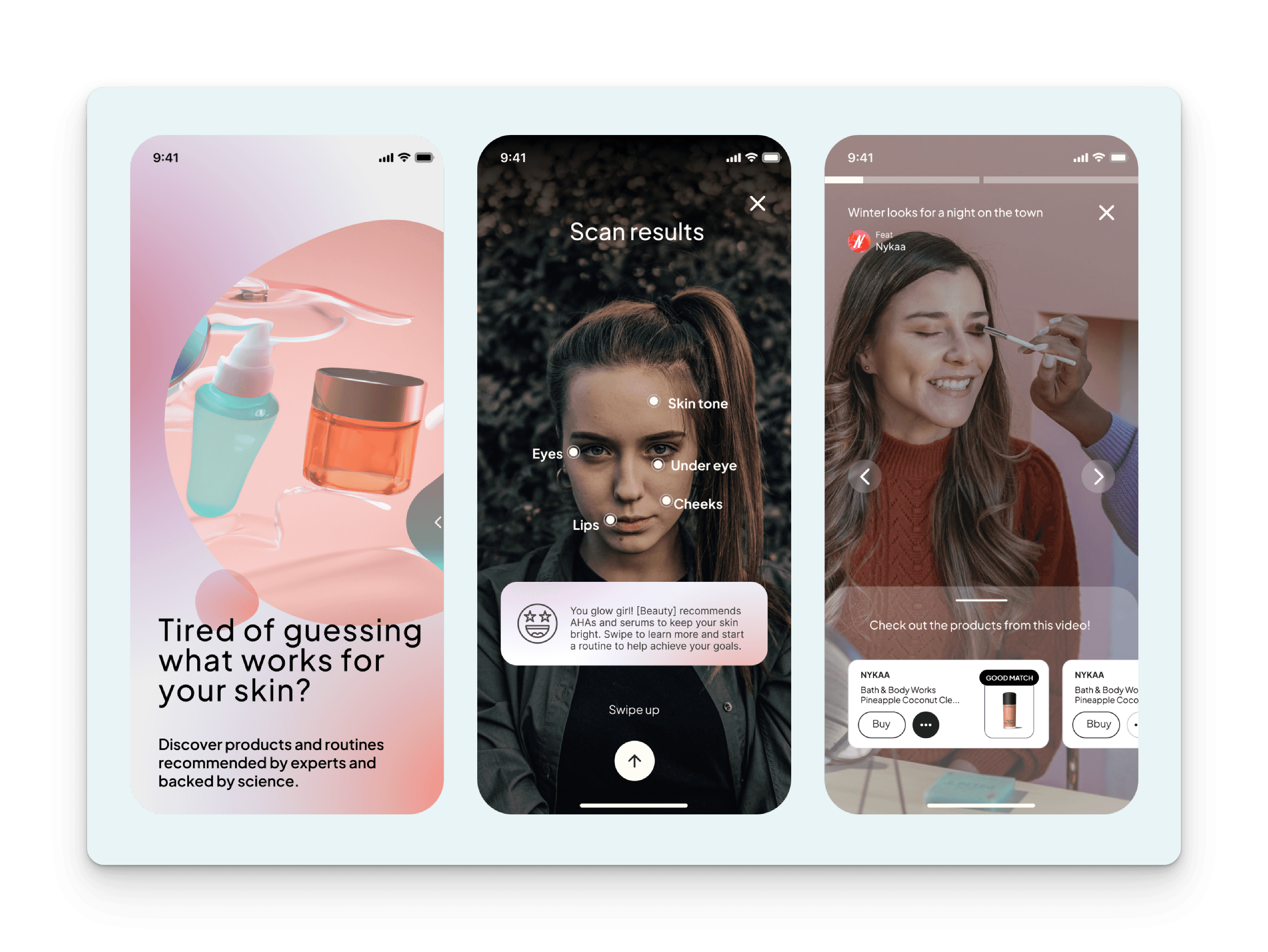 We designed an overall experience that let users take control of their beauty and skincare routines, form healthy habits, and find new brands through a network where beauty professionals, skincare experts, and community members connect.
